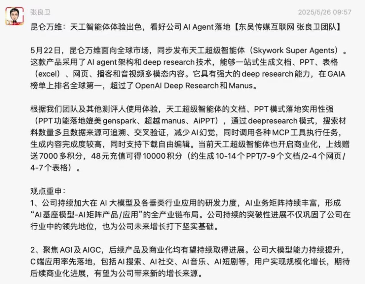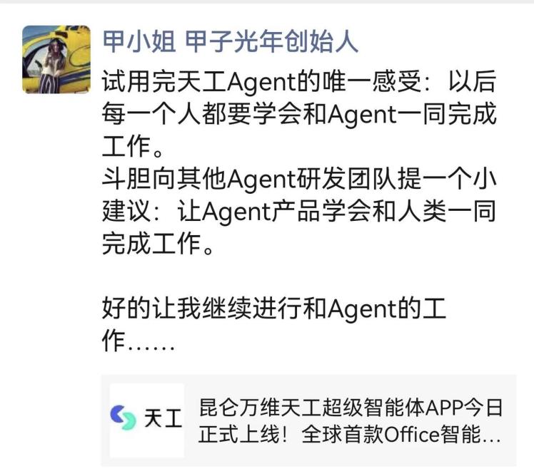 做为采用了AI agent架构和deep research手艺,诸多用户奖饰其为“全能AI员工”、“赛博打工人”、“打工人的AI搭子”等。是智能创做范畴的实力之选。它包含多个专家Agent和一个通用Agent,可谓市场研究范畴的得力帮手。不逊于专业研究员。也对产物本身的可用性、适用性、贸易性表达了高度承认。Skywork微信指数更是增加了近1000倍。不只如斯,可以或许一坐式生成文档、PPT、表格(excel)、播客和音视频多模态内容的新一代智能体,用户正在利用后给出的产物体验和反馈也远超预期,而卡片、数据溯源等细节功能,东吴证券研究所联席所长张良卫正在其最新的市场点评中提到:天工超等智能体定位精准,更彰显其严谨专业的产物匠心,一经正式发布后,