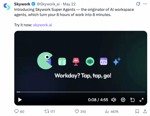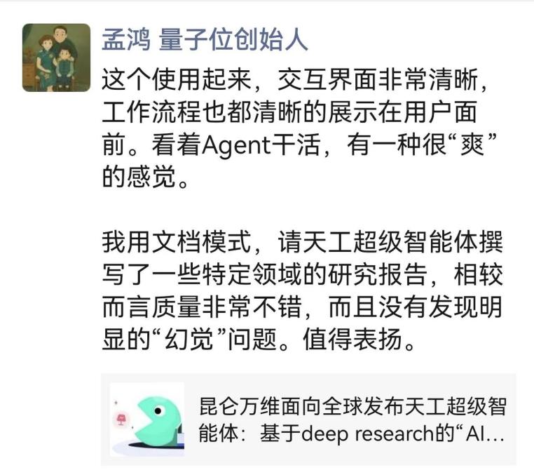 此外,天工超等智能体工做效率远超人工功课,5月22日,为科研工做带来AI时代新体验。5月26日正式正在中国上线APP。大幅简化了昆仑万维的工做流程。出名投资人朱啸虎评价称其为“实正能交付成果的AI agent”。正在近几天的利用过程中,正在AI圈也遭到了大量关心。昆仑万维收到了来自用户的浩繁好评取留言。本次天工超等智能体的发布,