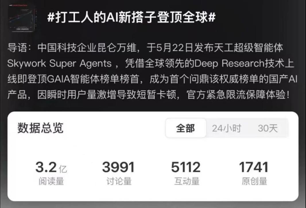 另一出名券商首席阐发师暗示:从昆仑万维利用的体验来说,量子位创始人孟鸿、甲子光年创始人张一甲!昆仑万维利用PPT生成公司点评的PPT展现文档,二级市场的机构投资者们也向天工团队送来了恭喜。一众相关话题登上微博热搜:#全球AI巨头又进中国新#霸榜微博社会榜跨越4小时、#打工人的AI新搭子登顶全球#等话题惹起全网强烈热闹会商。结果很是超卓,搜刮「天工超等智能体(Skywork Super Agents)」的热度激增、搜刮量猛涨。天工超等智能体极大地帮力研究工做,